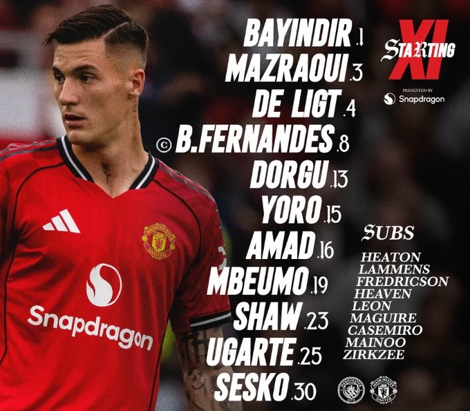 Manchester United: Altay Bayindir, Leny Yoro (Maguire 62′), Matthijs de Ligt, Luke Shaw, Noussair Mazraoui (Mainoo 62′), Manuel Ugarte (Casemiro 80′), Bruno Fernandes, Patrick Dorgu, Bryan Mbeumo, Amad Diallo, Benjamin Sesko (Zirkzee 80′).