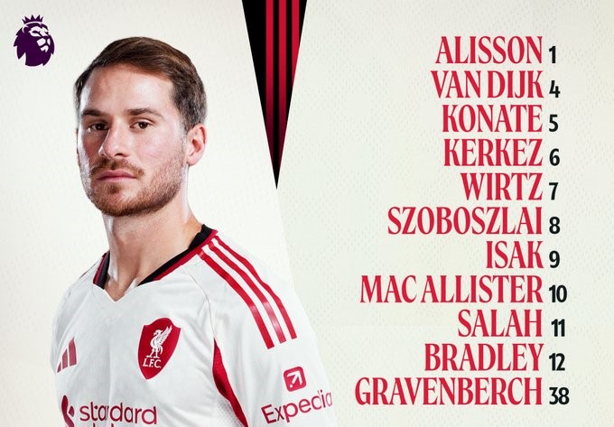 Hỗ trợ cho Isak là bộ ba Salah – Szoboszlai – Wirtz trong khi án ngữ ở tuyến giữa là hai cái tên quen thuộc: Gravenberch vs Mac Allister. Milos Kerkez đảm nhận cánh trái nhưng một tân binh khác, Frimpong vẫn chỉ ngồi dự bị cho tài năng “cây nhà lá vườn” Conor Bradley.