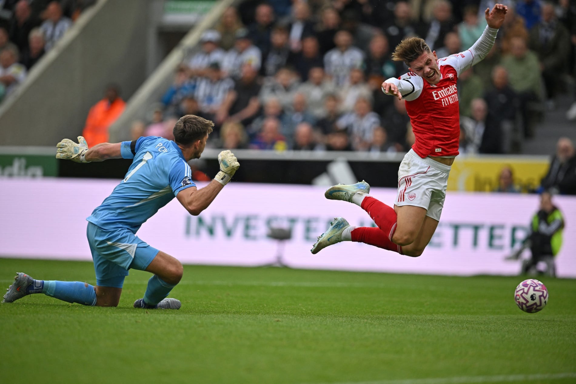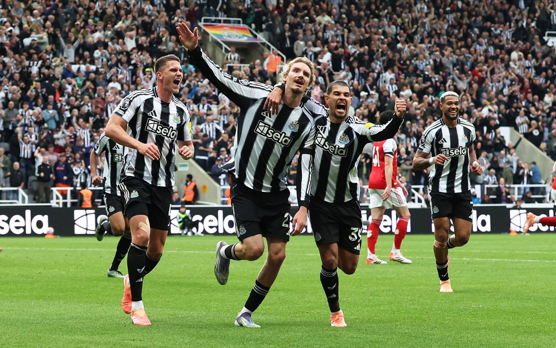 Phút 25, Trossard có pha dứt điểm cận thành nhưng bóng đã trúng vào cột dọc gần. Song trong thế trận lấn lướt, Arsenal lại phải nhận bàn thua. Phút 34 ở một tình huống phạt góc, Tonali đã treo bóng mẫu mực vào giữa khu vực 16m50 và Woltemade bật cao đánh đầu tung lưới David Raya.